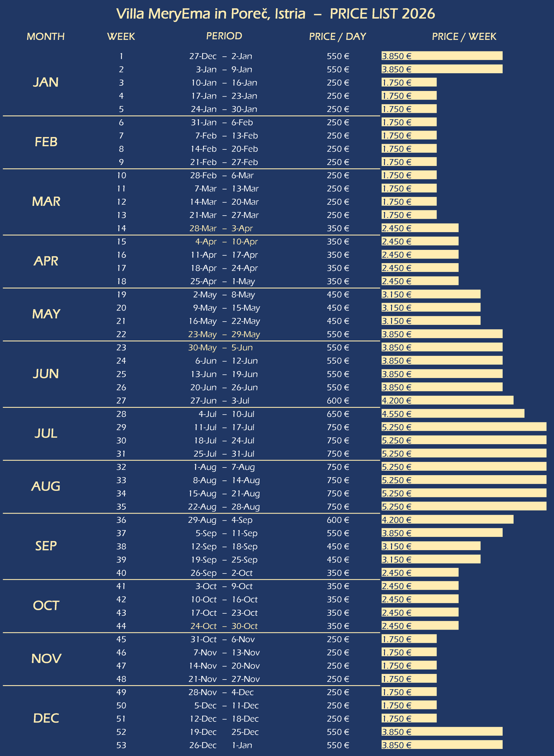Check out our pricelist for all dates of 2026. In case you want to check availability or book your stay in our villa, please use the form on this page. In case you need assistance, please do not hesitate to contact us.